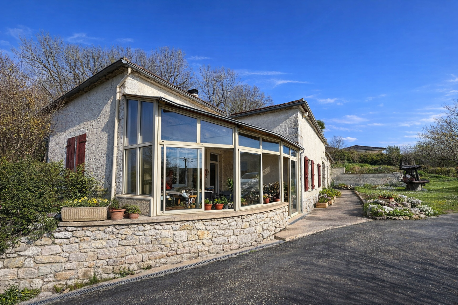 La maison, partiellement rénovée en 2024, dispose d’une agréable pièce de vie moderne (salon / cuisine de 29 m²) avec travaux récents : électricité, plomberie, double vitrage, placo et isolation.