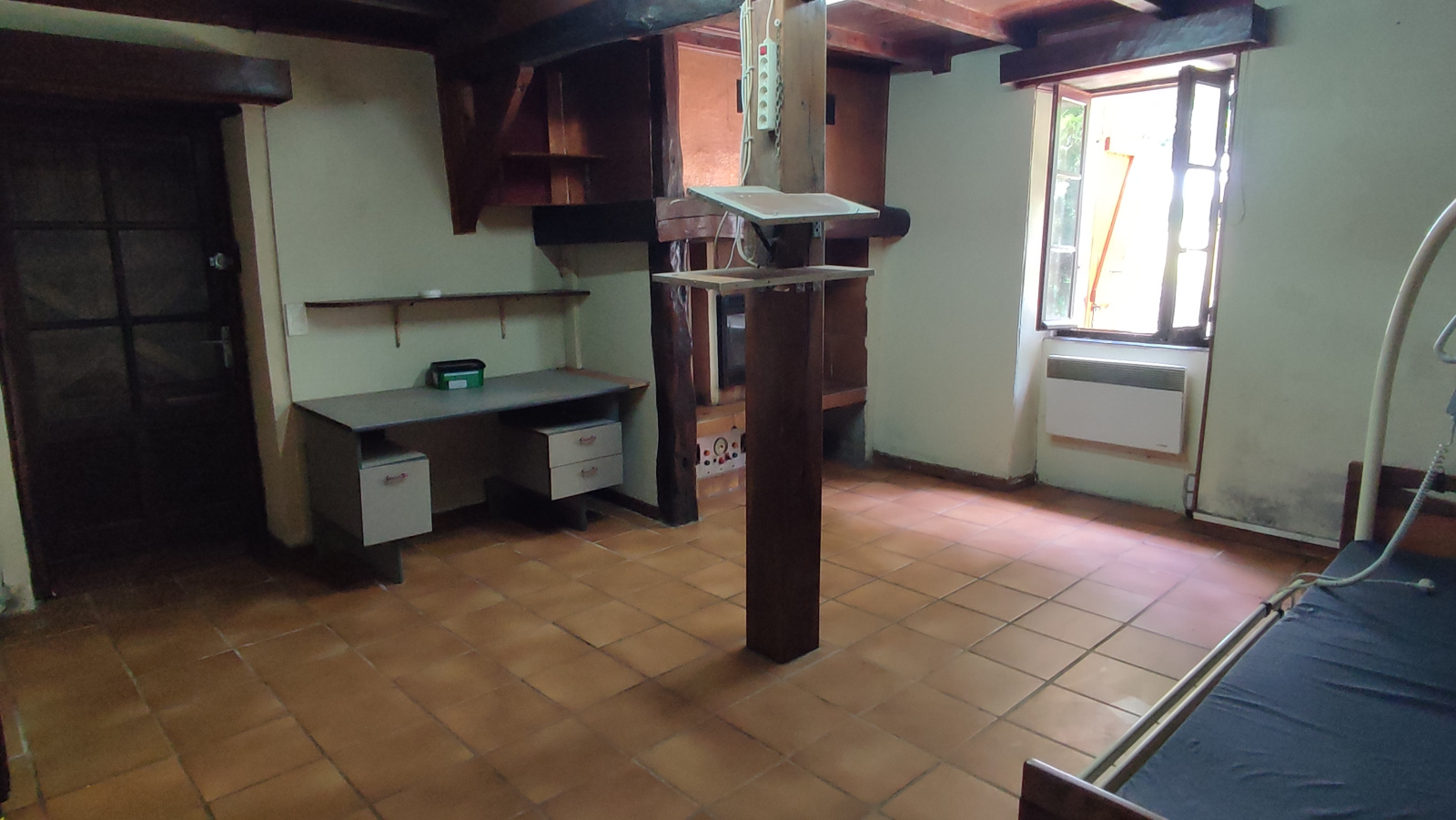 Une chambre de 24m² avec insert (ancienne cuisine) porte accès sur l’extérieur.