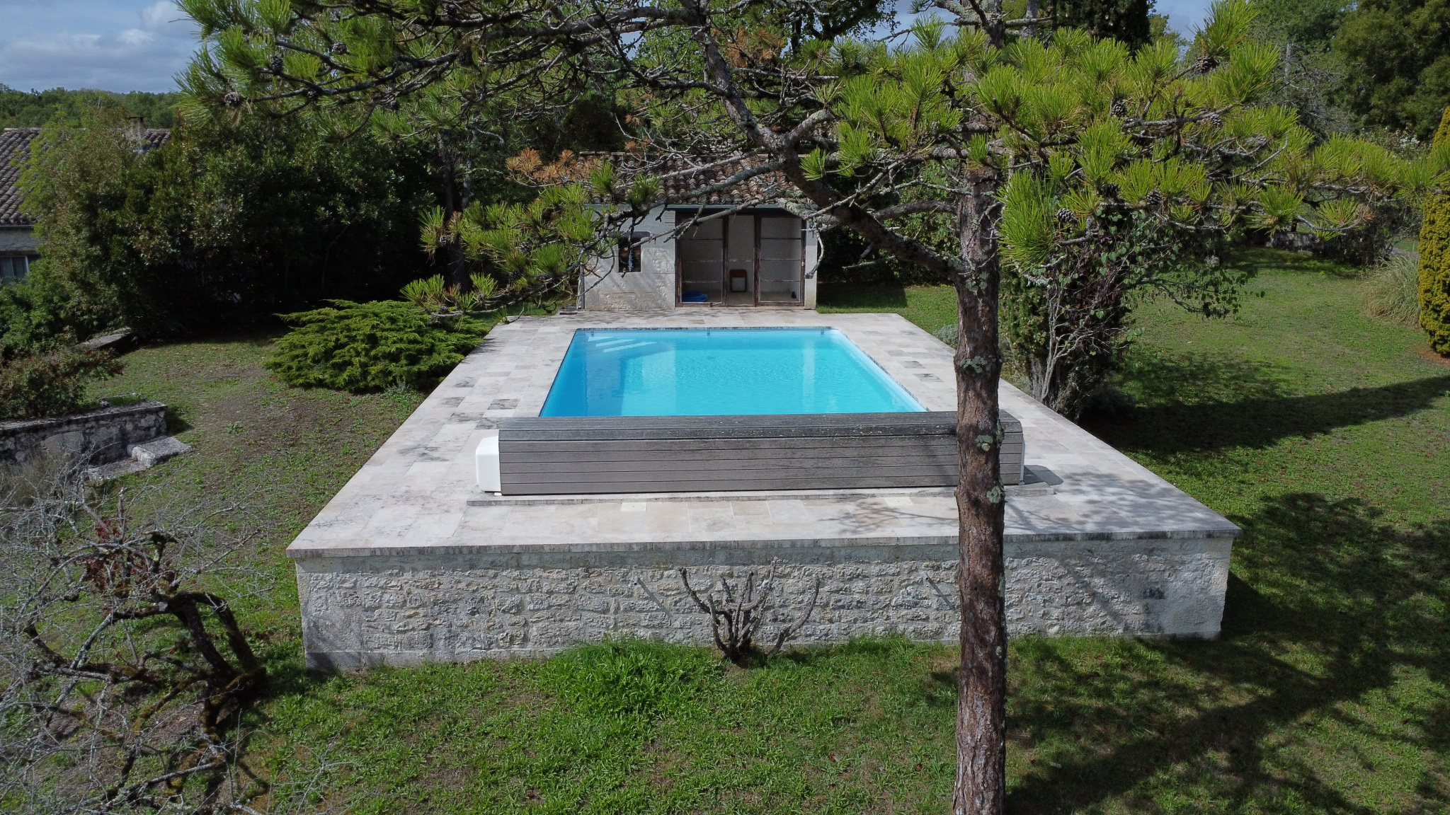 Terrasse en travertin + terrasse couverte avec vue dégagée