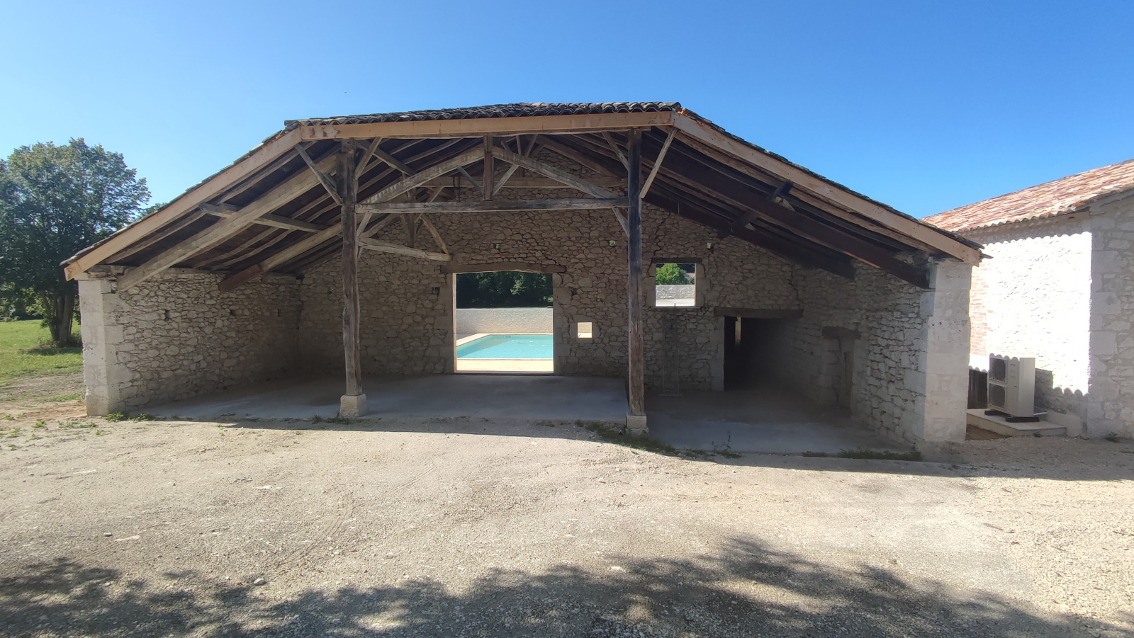 Une partie de la grange est fermé et parfait pour un atelier ou rangement, le reste accueuille une magnifque piscine donnant sur un auvent couvert restauré.