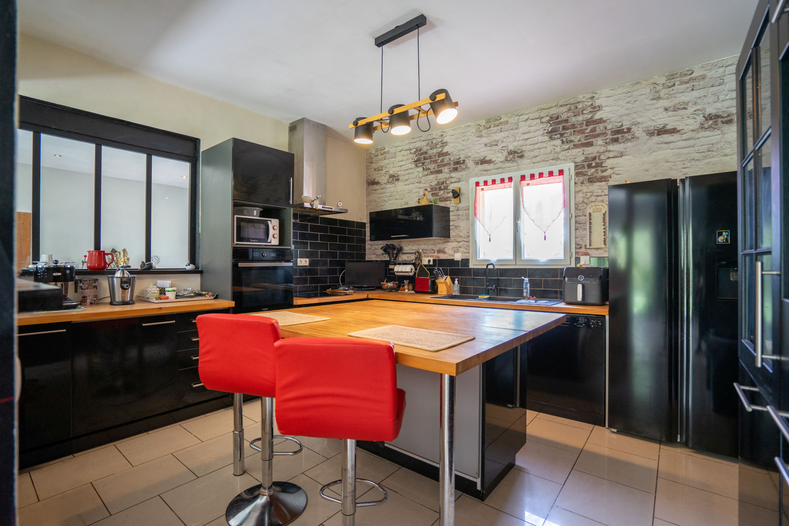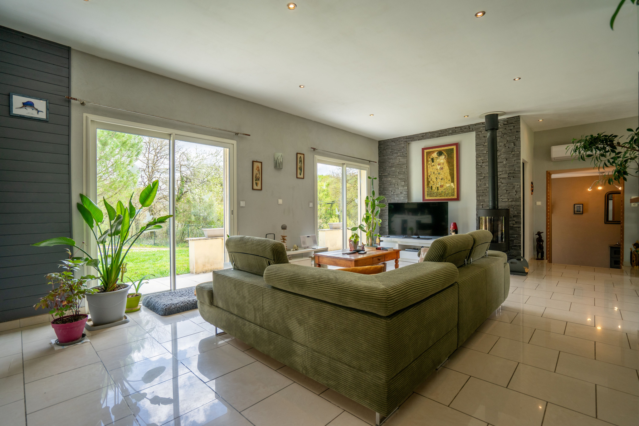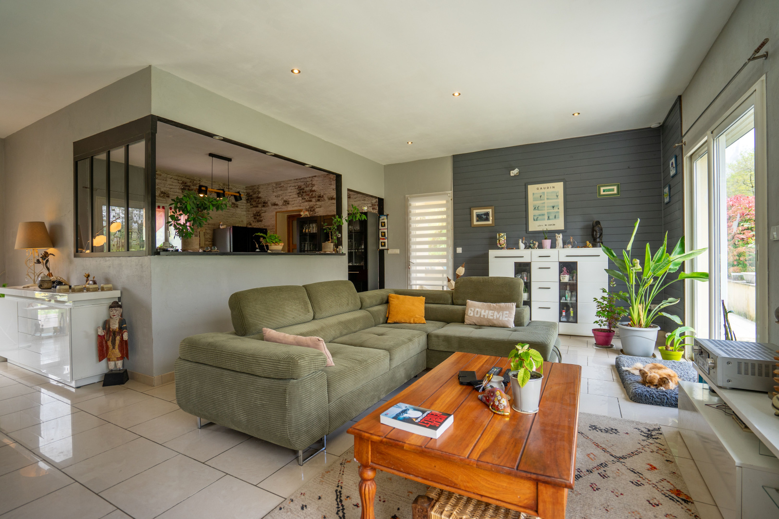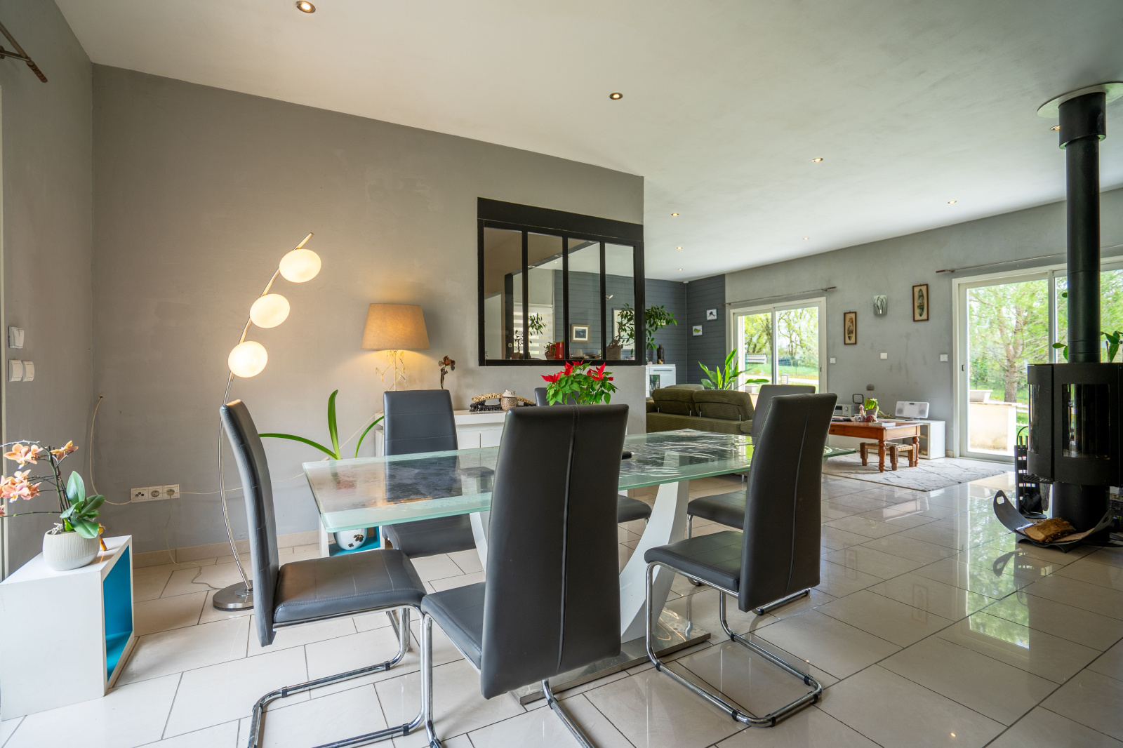 D’une superficie habitable d’environ 146 m², la maison s’ouvre sur une vaste pièce de vie baignée de lumière de plus de 50 m², avec cuisine ouverte entièrement équipée.Cet espace chaleureux est équipé d’un poêle à bois et d’une climatisation réversib