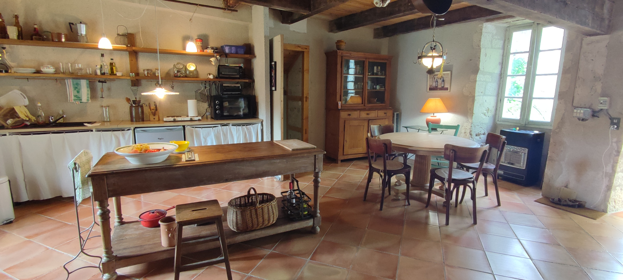 À gauche de la cuisine : un vaste salon de 40m² avec cheminée en pierre et accès direct au jardin.