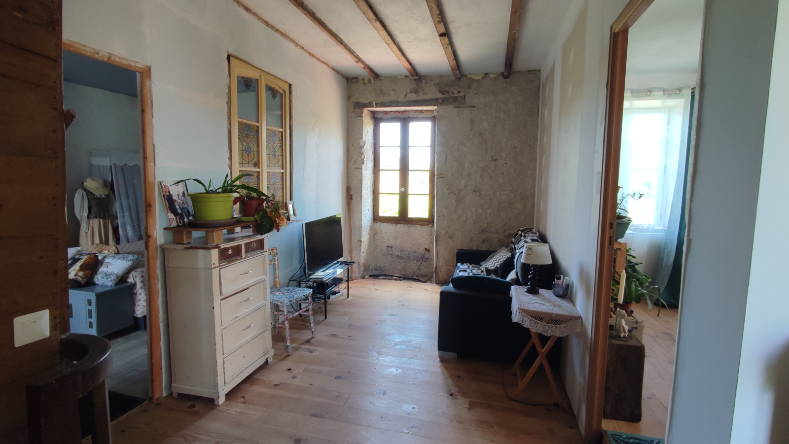 À l’étage, un vaste palier en parquet fait office de coin lecture et petit salon. Un espace est également prévu pour un bureau. Une première chambre, chaleureuse et entièrement terminée, dispose d’un superbe dressing et d’un accès à une terrasse privée offrant une vue imprenable sur la campagne. Une seconde chambre, bien que non rénovée, est déjà confortable, lumineuse et spacieuse. Aucun travaux ne sont à prévoir pour les chambres.
