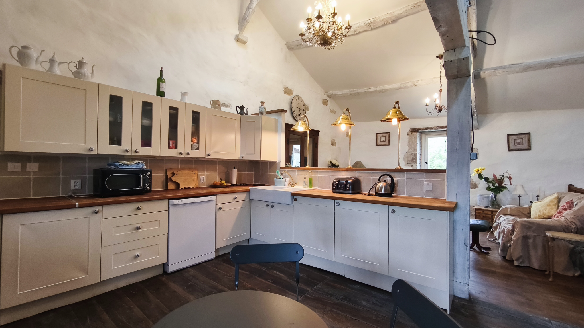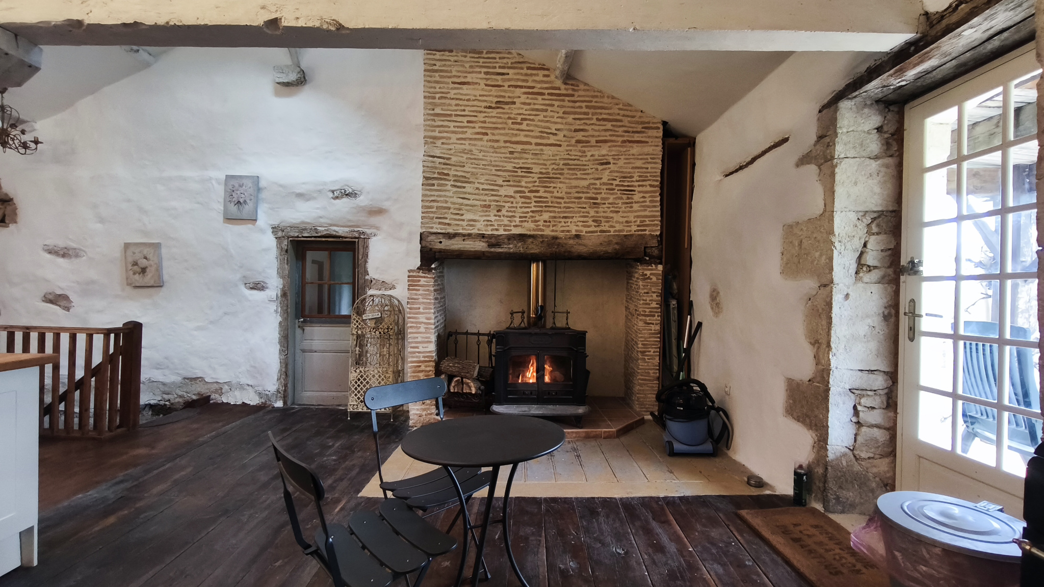 une cuisine équipée avec salle à manger - salon 50 m² avec une cheminée équipée d'un poêle à bois