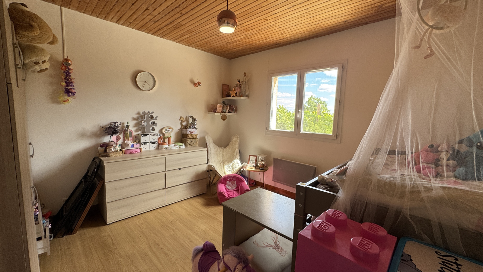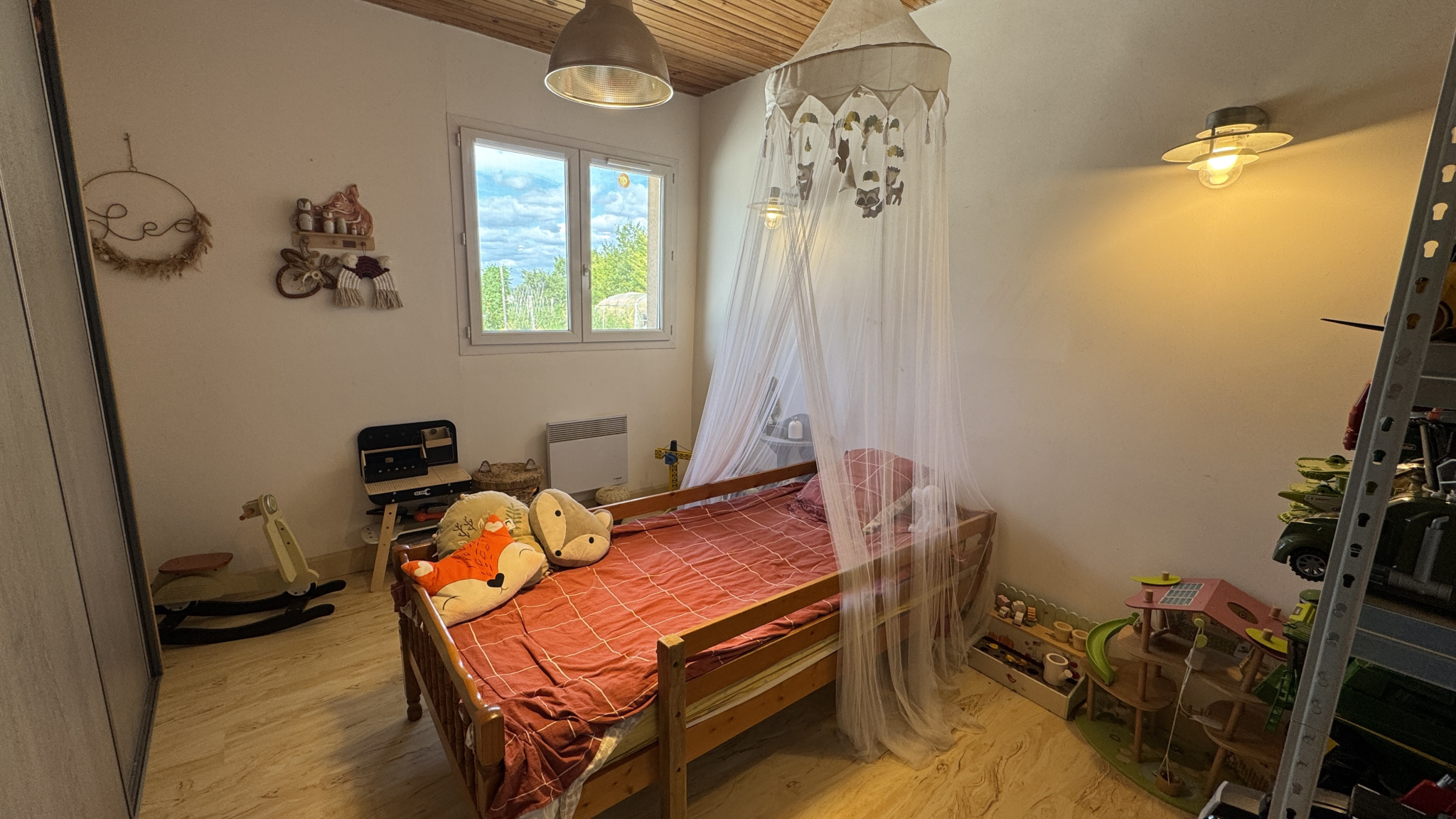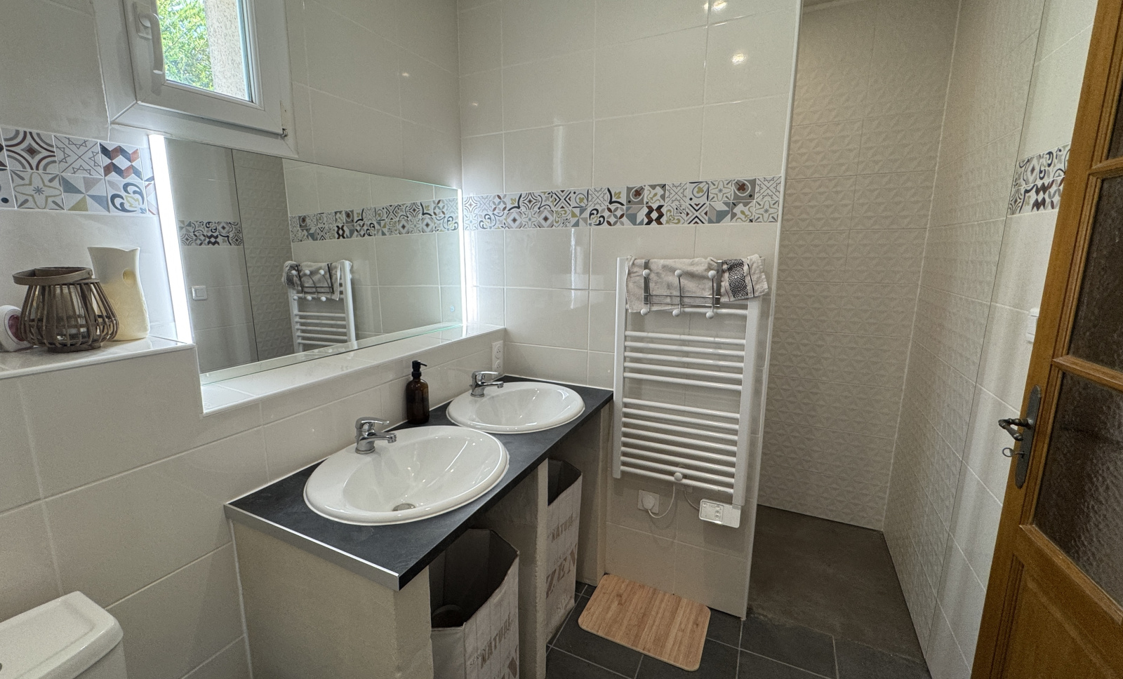 Côté nuit, la maison dispose de quatre chambres, dont une suite parentale avec salle d’eau privative et WC, ainsi qu’une seconde salle d’eau moderne avec double vasque et WC séparé.