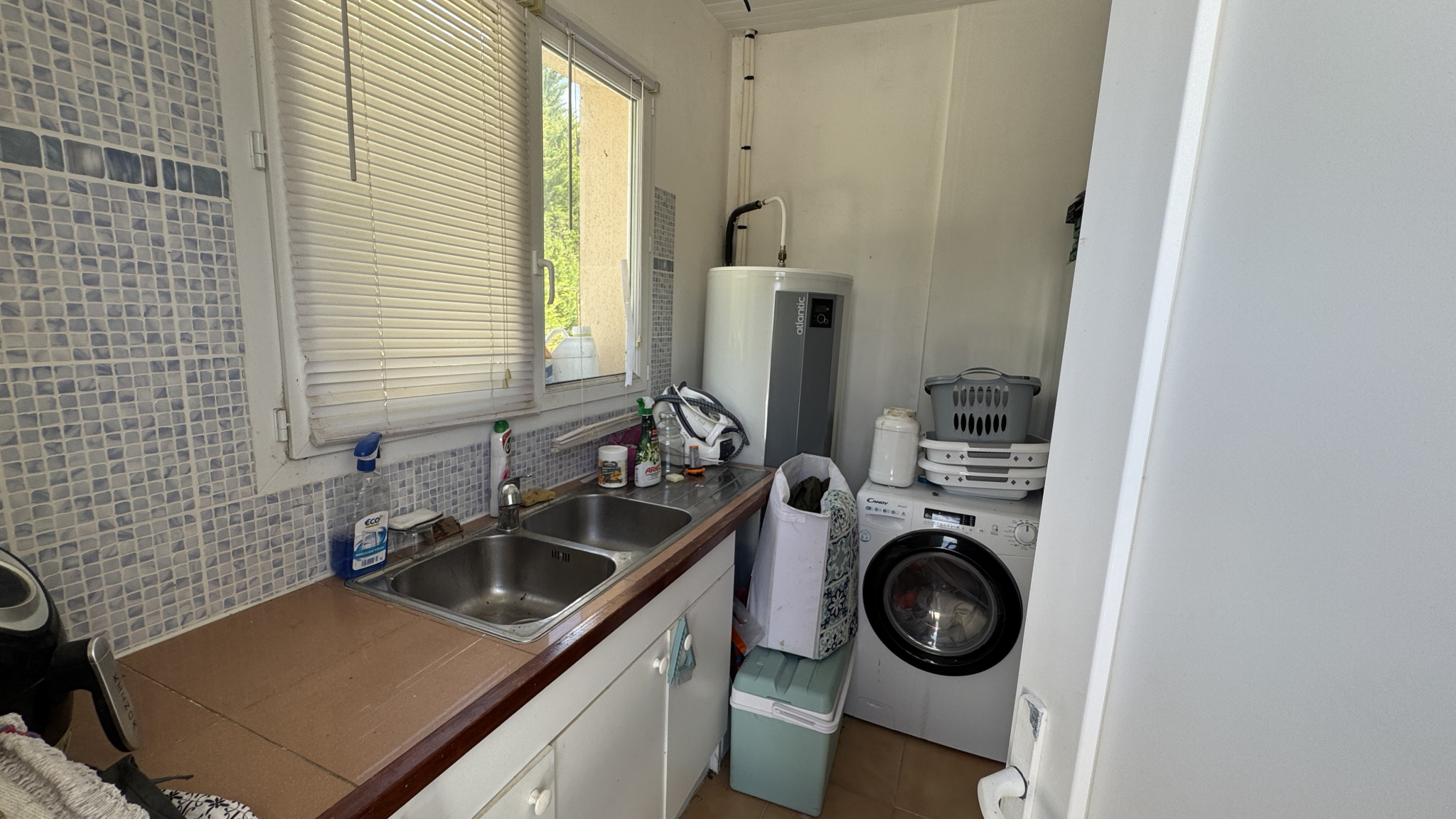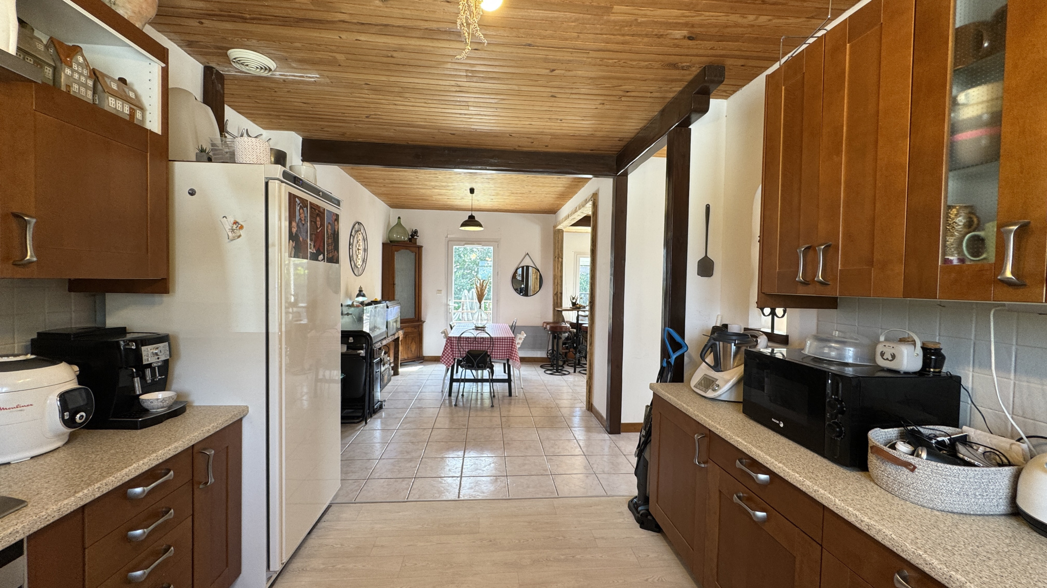 La cuisine ouverte et entièrement équipée de 12 m² prolonge harmonieusement l’espace de vie, parfait pour partager des moments conviviaux en famille ou entre amis.