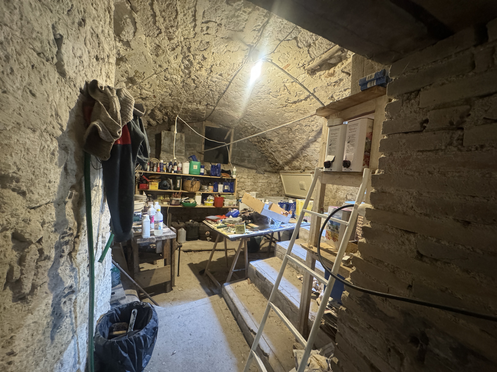 Sous-sol : Deux caves voûtées, dont une de 38 m² servant de garage (petite voiture), l’autre de 15 m²