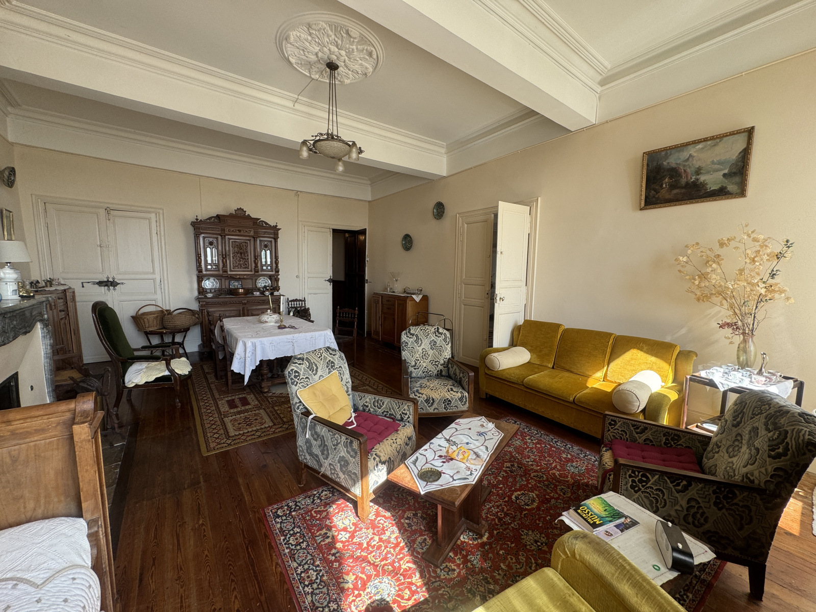 Spacieuse entrée de 16 m² avec carreaux de ciment au sol, Bureau de 15 m², Cellier de 2 m², Grande cuisine de 30 m² avec accès direct à un jardin de 30 m², Salle de bain avec WC de 8 m², Salon de 38 m² avec cheminée en marbre et parquet bois , Salle à manger de 38 m², également avec cheminée en marbre et parquet