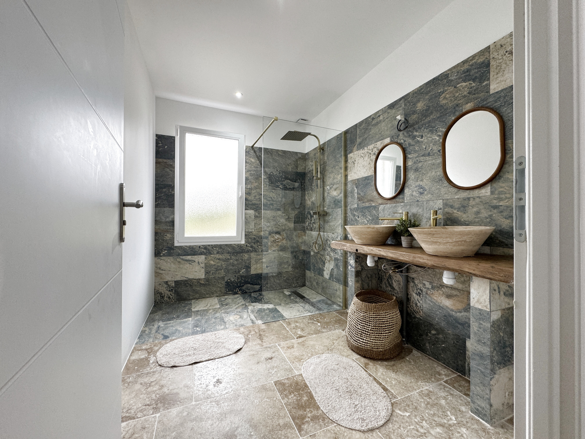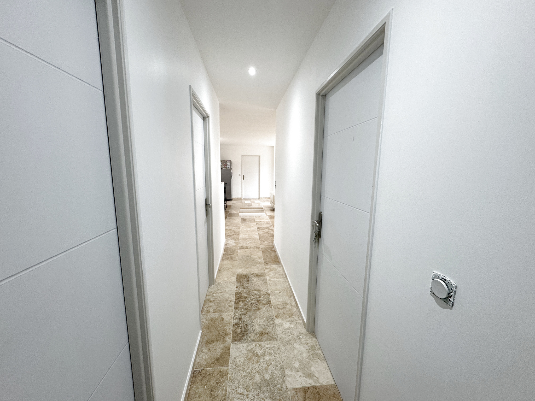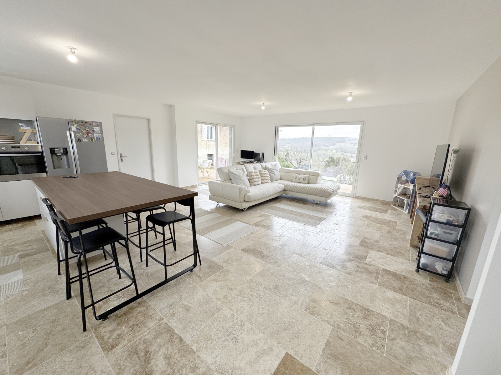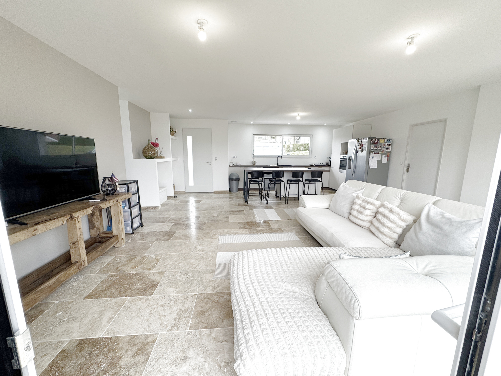 Vous serez immédiatement séduit par sa vaste pièce de vie de 50 m², baignée de lumière, regroupant séjour, salle à manger et cuisine ouverte. Les sols en travertin, présents dans toute la maison, apportent une touche élégante et chaleureuse.