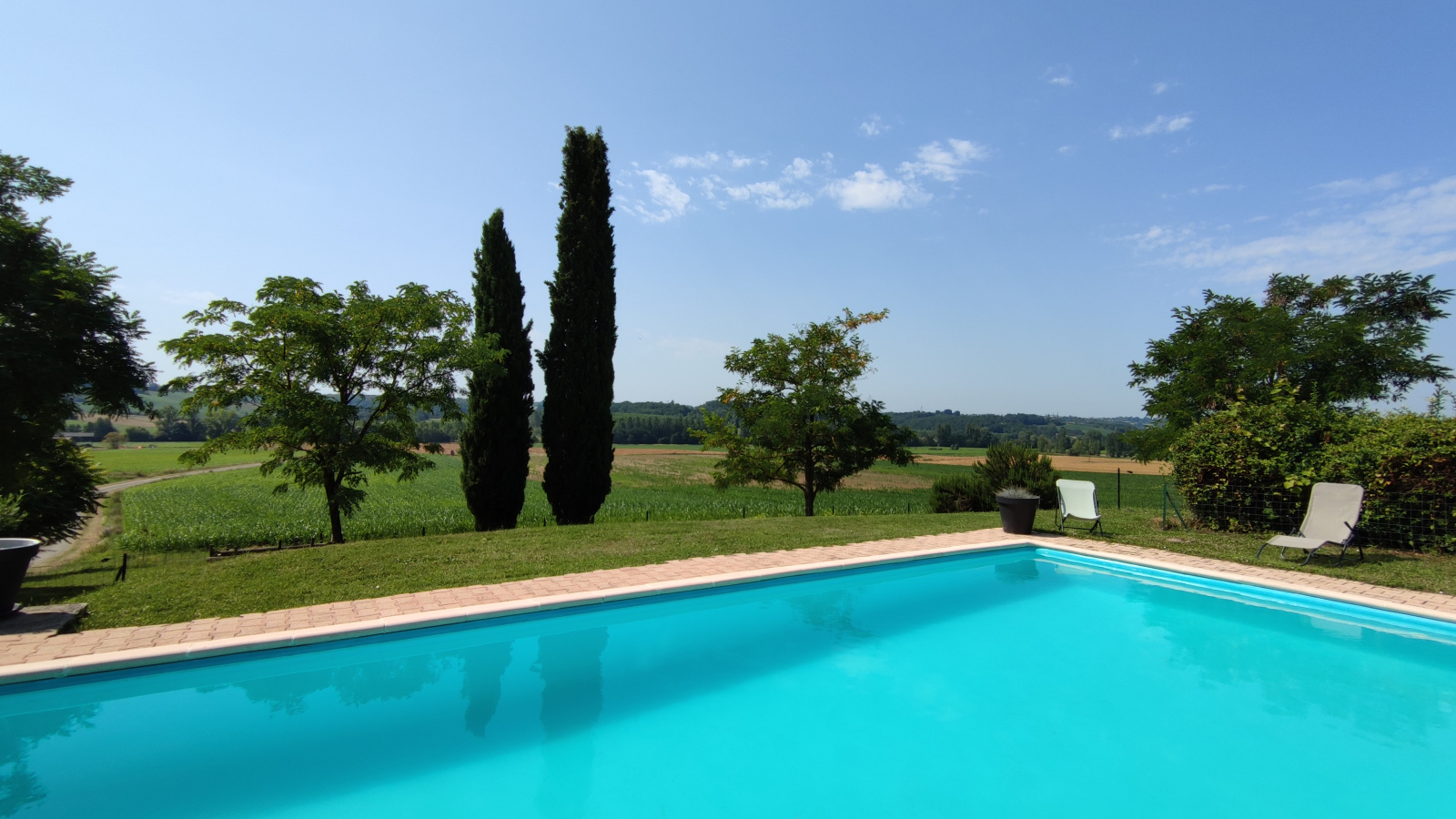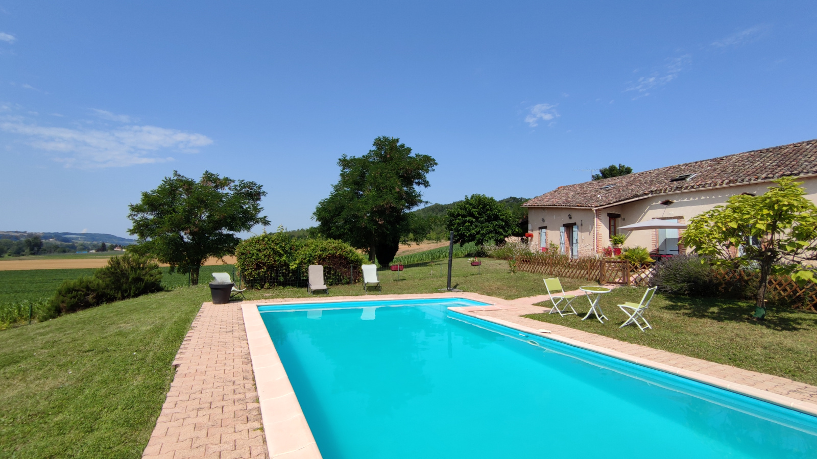 un garage 44 m², une piscine 10 x4m avec un escalier - profondeur 1,60 m , chauffée par une pompe à chaleur - Traitement au chlore