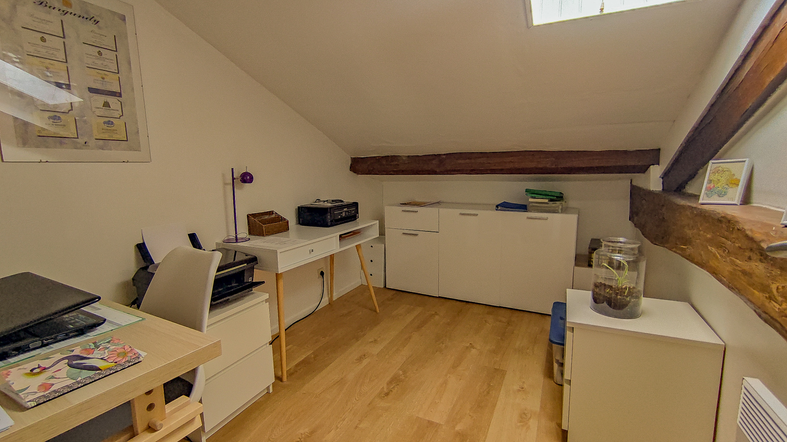 en rez de jardin : une cuisine équipée de 12,3 m², un salon de 39 m² avec poêle à bois donnant sur une terrasse couverte, un dégagement de 11 m² desservant, une salle d'eau de 5m², un local technique de 3m², un wc-bain de 3m². A l'étage des pièces mansardées : un palier, un bureau, 2 chambres, une salle de massage, une salle d'eau, un wc et un grenier