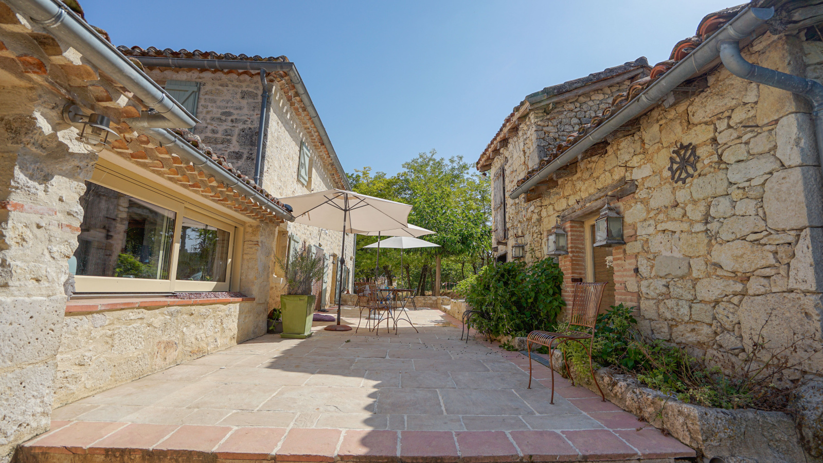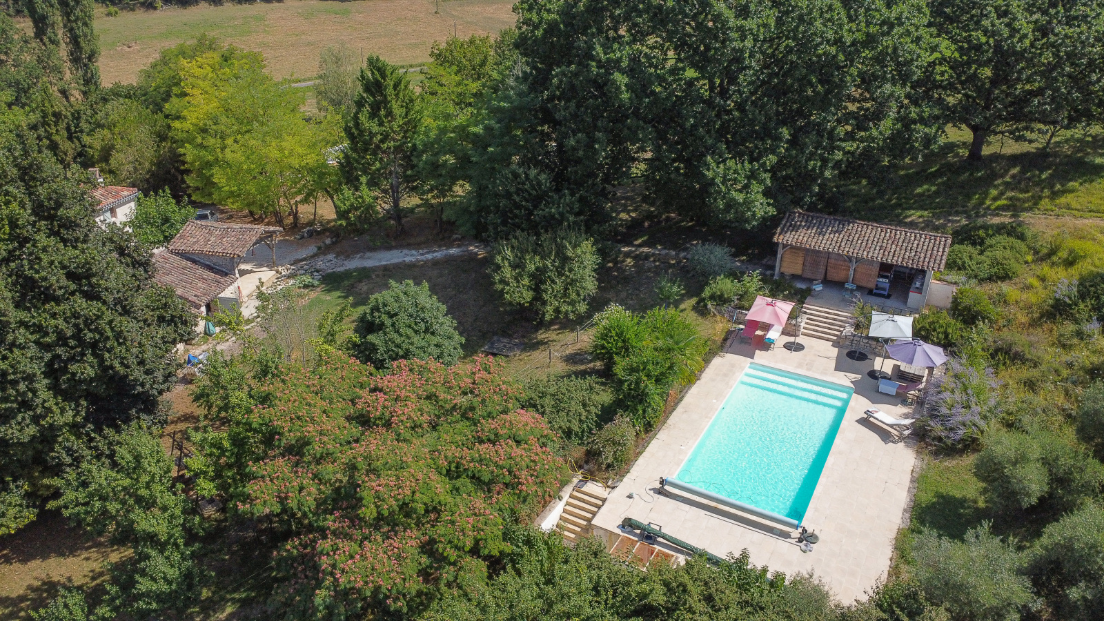 La propriété se compose d'une maison quercynoise de 320 m² habitable avec un superbe pigeonnier-bolet, de nombreuses dépendances, une piscine et 7,5 ha de terrain, dont 3,5 ha de prairies