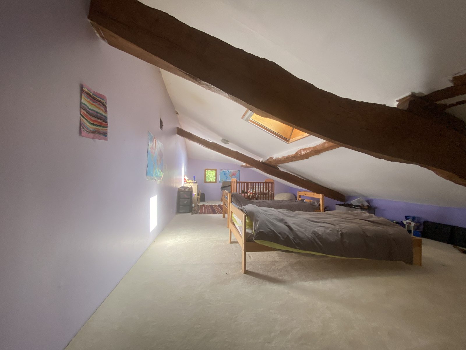 Grande pièce de vie lumineuse de 46 m² (séjour/cuisine), salon chaleureux de 39 m², entrée spacieuse de 32 m², deux grandes chambres sous rampants, deux salles d’eau, une par niveau, sous-sol de 130 m² à restaurer avec cheminée ancienne et arche en brique : idéal pour créer un espace de réception, un atelier ou une sellerie