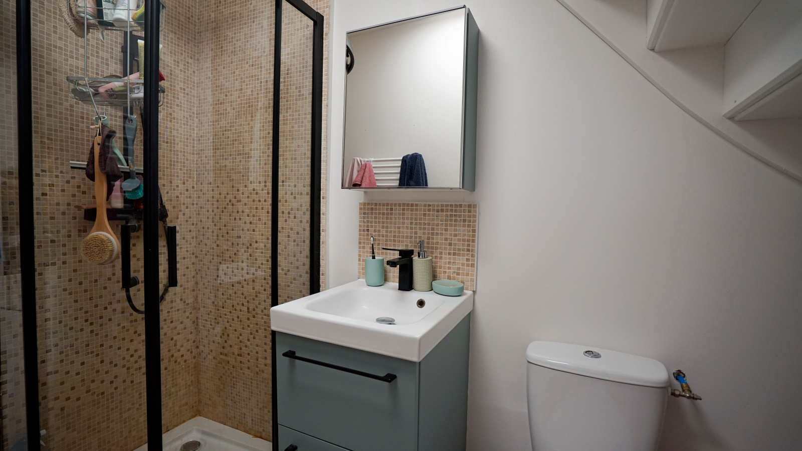 - Salle de bain : 3,5 m², comprenant un lavabo, une douche et un WC